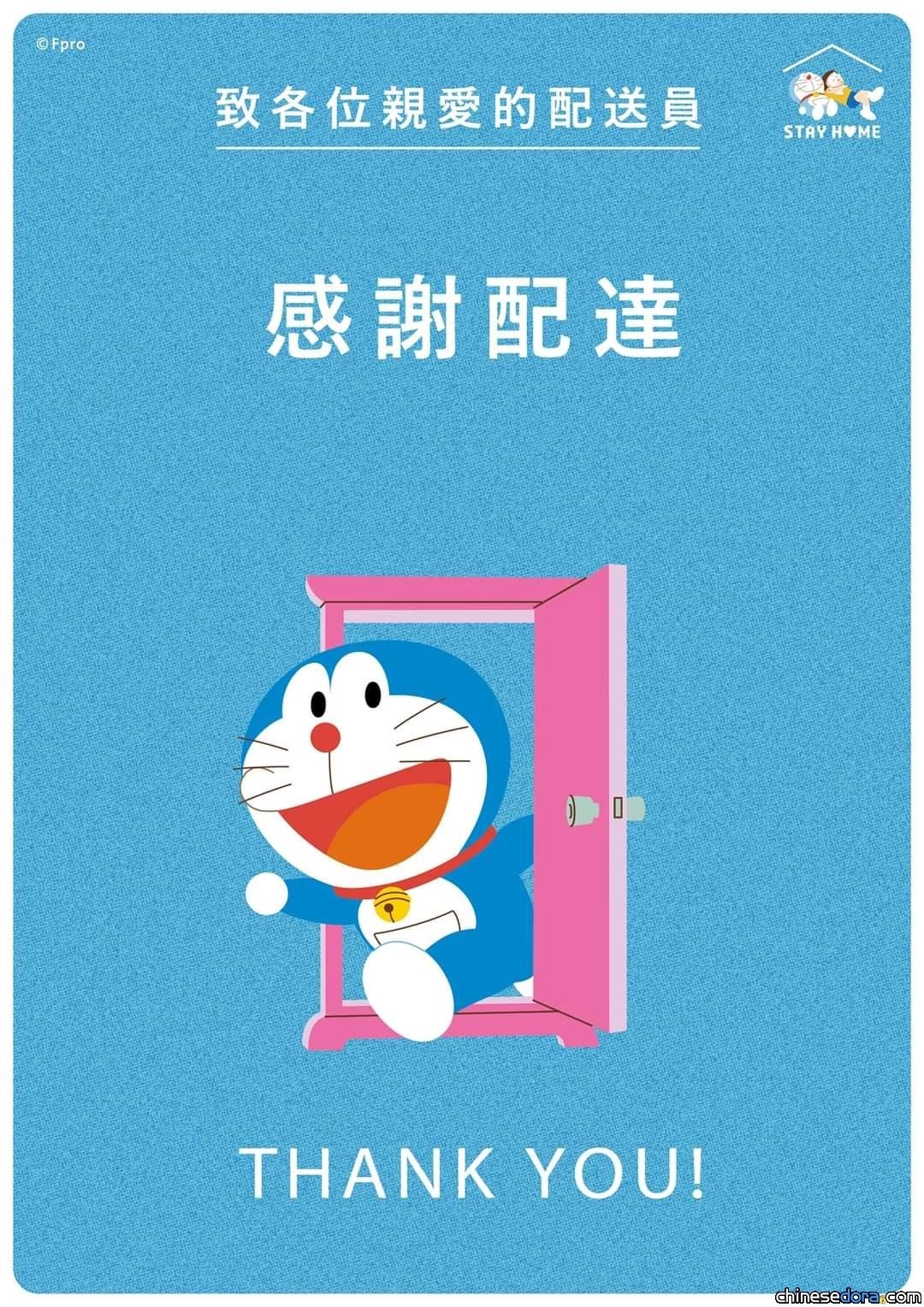武漢肺炎疫情(COVID-19)在台灣持續延燒,疫情警戒標準升至第三級,各種設施與活動接連休館或延期,政府也呼籲大家避免群聚。由於大家減少外出,外送需求也隨之大增,哆啦A夢台灣官方粉絲團 Doraemon Taiwan 在臉書貼文提供一系列感謝餐飲業者與外送員的中文海報供需要者使用。